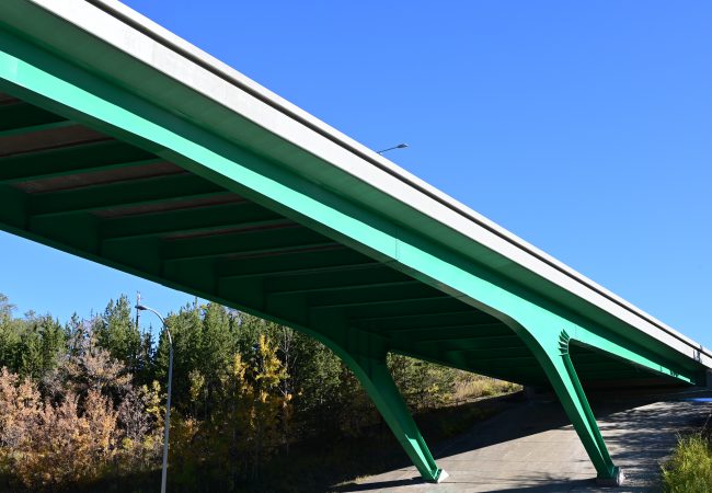 The project consists of rehabilitation of Ada Boulevard bridge located within Edmonton’s River Valley. Scope of work includes demolition of existing elements from wingwalls, deck joints, bridge rails, South curb, and delamination repairs on abutments, backwalls and wingwalls. Project also includes pouring concrete for deck overlay, sidewalk and two concrete barriers across the span of the bridge. New bridge rails guard rails and light poles were installed. All Steel elements of the bridge were coated with new painting which required complete hoarding and containment.