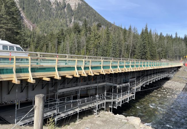 The Albert Canyon project for BCMOTI is CWP’s largest project to date ($12.3M) and is located on the Trans-Canada Highway, approximately 34km East of Revelstoke, BC. This project consists of installing a detour bridge over the Illecillewaet River, detour road, bridge rehabilitation and steel bin wall rehabilitation. The detour bridge supplied by Acrow was assembled onsite and cantilever launched over the river. The detour bridge and road will be removed at the end of the project once the bridge rehabilitation is complete. The bridge rehabilitation scope of work includes the reconstruction of the concrete overhangs, new parapets, bicycle railing, bridge deck repairs, bridge deck concrete overlay, deck joints, approach paving, bearing replacements, and substructure steel re-coating. The bin wall rehabilitation scope of work includes rock anchoring, shotcrete and a cast-in-place concrete retaining wall.
