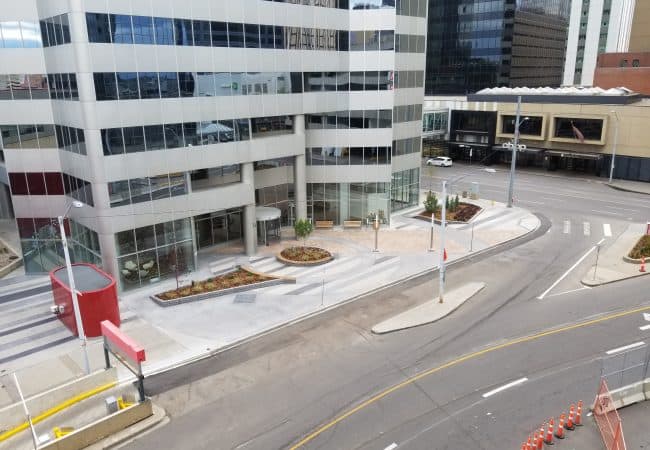 The project consists of demolition and removal of the existing wear surface and planters. Removal of the old waterproofing system, demolition, and repair of the existing structural slab, replacement of the existing drains, plumbing and associated electrical system. Installation of a new waterproofing membrane, installation of a new concrete topping and new concrete planters, associated electrical works, new paving stone and associated landscaping works. All work is was completed above existing parking structure space. Working with the public and client to accommodate the pedestrian and vehicle traffic through work zones during high profile events at Rodgers place was paramount to the success of the project. The success of the project has garnered high level BOMA-Best awards for the building operators and owners, and received attention in the architectural community for the beauty of the finished plaza deck.