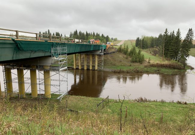 This project is located along Highway 12 over the Medicine River. The scope of work includes piling, rebuilding the abutments (Backwall, Grade beam, Wingwalls, roof slab, approach Slab waterproofing/drainage layer), Partial Depth repairs on the Deck and Abutment face, Waterproofing and ACP paving on deck, Head slope Improvements, transition paving, Bridge Rail Upgrade, and new Approach Rails.