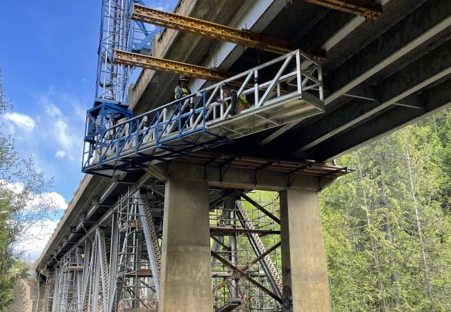 This is CWP’s second bridge rehabilitation project with BCMOTI. The Summit Creek bridge is located on Highway 3, approximately 10 km West of Creston, BC. The bridge consists of a steel truss spanning between two concrete piers on either side of the river, steel girders, floor beams and diaphragms with a concrete bridge deck. The scope of work for this bridge rehabilitation included traffic accommodation, road surface removal, bridge deck concrete repairs, demolition of bridge deck overhangs, reconstruction of new overhangs complete with bridge parapets and bicycle parapet railings, installation of deck drains, deck joints replacement, steel truss modifications and coating, concrete deck overlay, roadway drainage improvements, approach asphalt paving and installation of concrete roadside barriers.